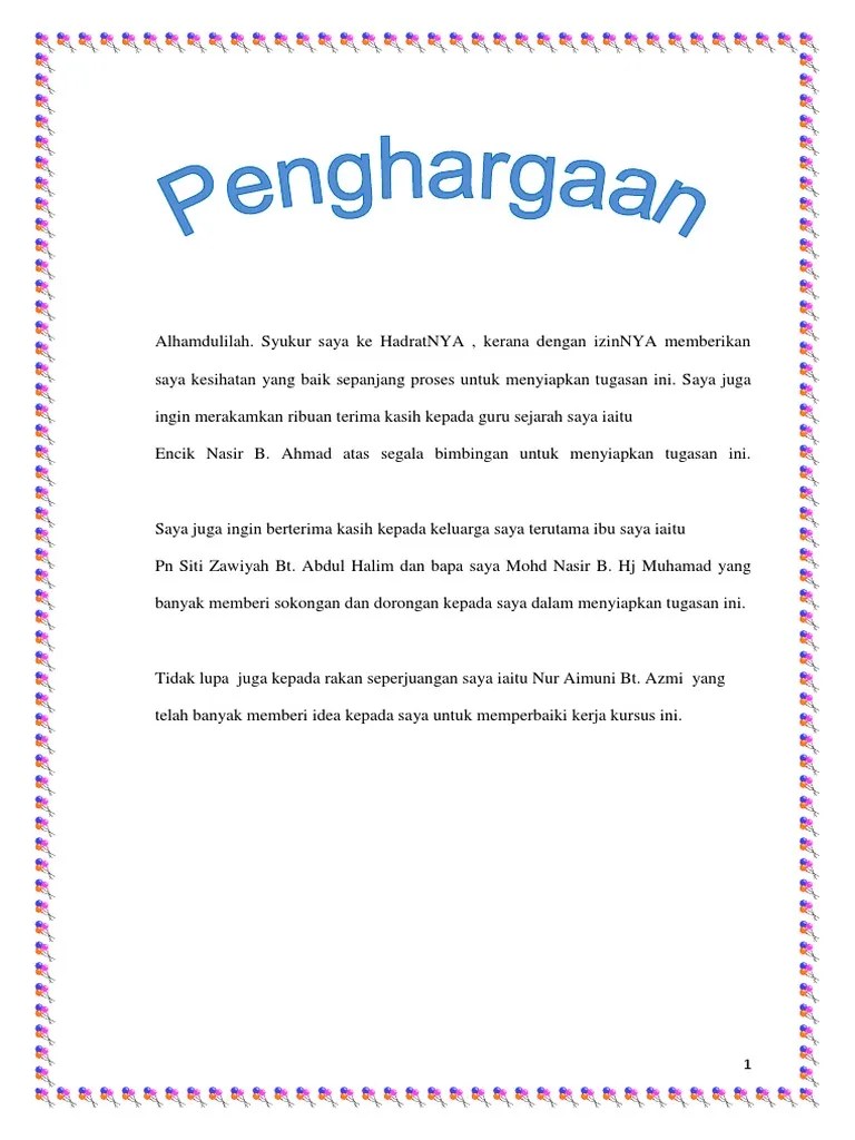 Memberi sokongan dan galakan kepada saya sepanjang saya melakukan kerja kursus ini penghargaan kerja kursus sejarah. Memberi sokongan dan galakan kepada saya sepanjang saya melakukan kerja kursus ini.
